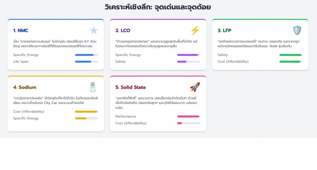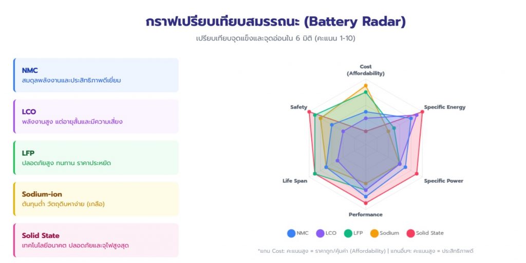 ไม่มีคําตอบเดียวสําหรับทุกคน หากเน้น ความคุ้มค่าและอายุยืน LFP คือคําตอบ หากเน้น ระยะทางและสมรรถนะ NMC ยังครองตลาด สําหรับ อุปกรณ์พกพา LCO ยังเปนมาตรฐาน ในขณะที Sodium กําลังเข้ามาตีตลาดราคาประหยัด